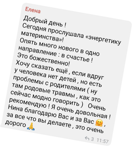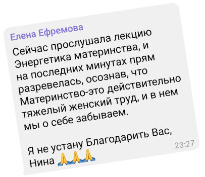 — За эти 3 года, без вложений и без команды, будучи "мамой в декрете", Нина создала бизнес, который приносит миллионы рублей ежемесячно. Этот успех является результатом знания энергетических законов, которые открылись Нине в момент пробуждения.